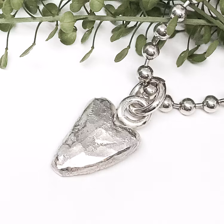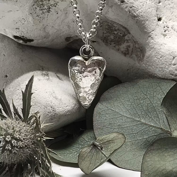 Handgjutet hjärta i återvunnet silver som formats för hand, inget är det andra likt.